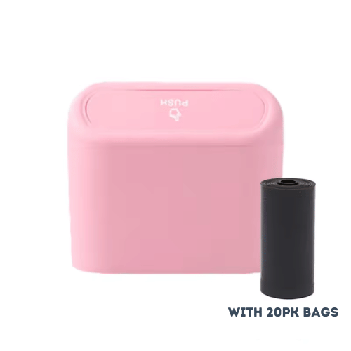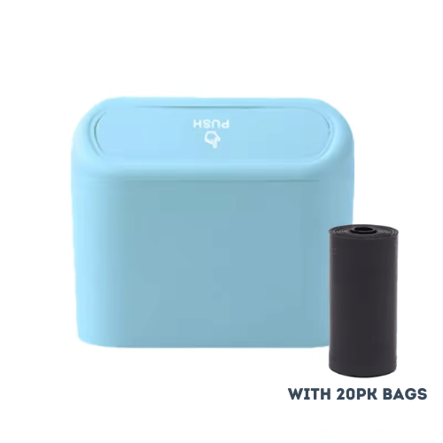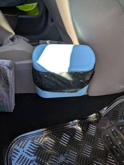 Included is a mini hanging car bin in your choice of colour, plus a 20pk of black rubbish bags.