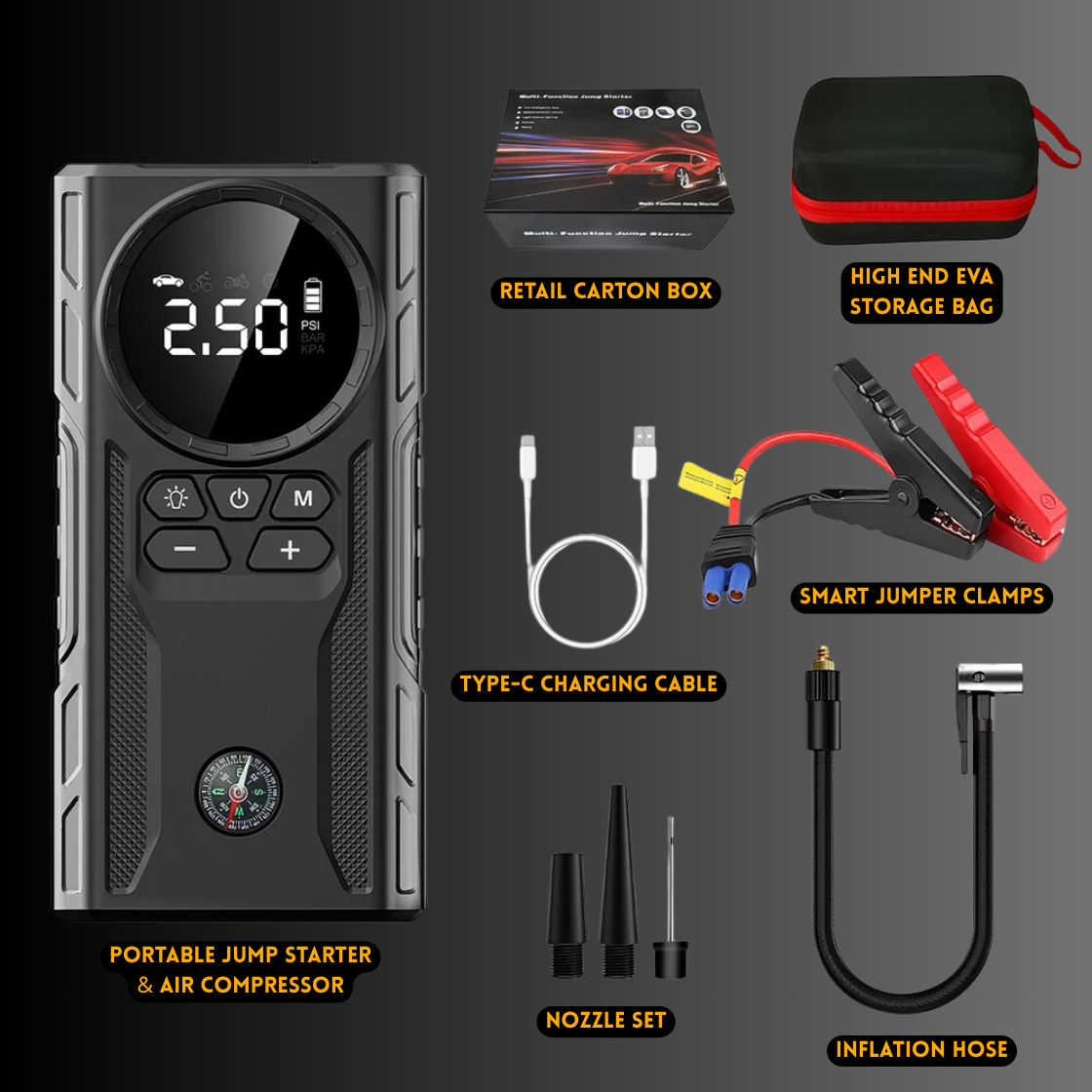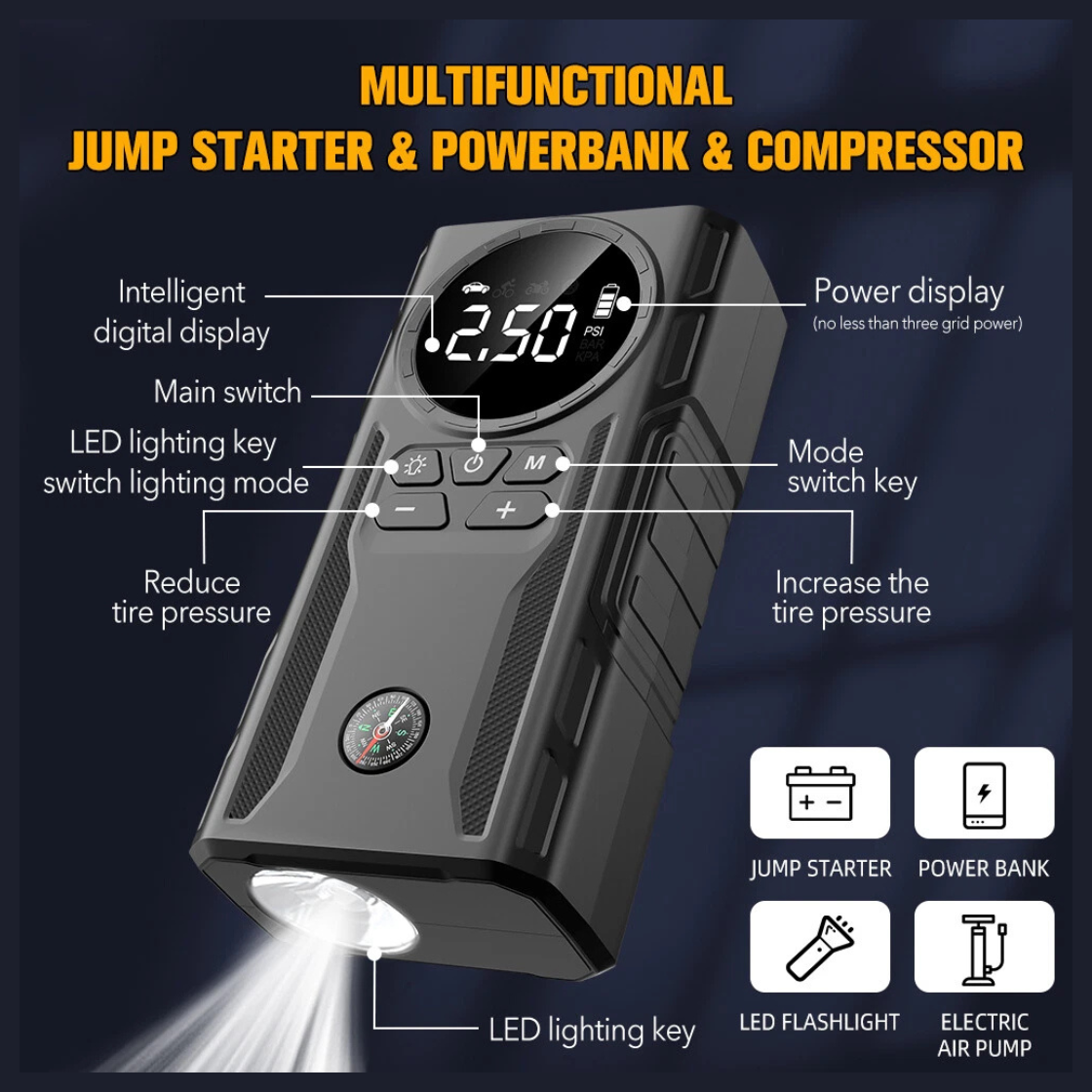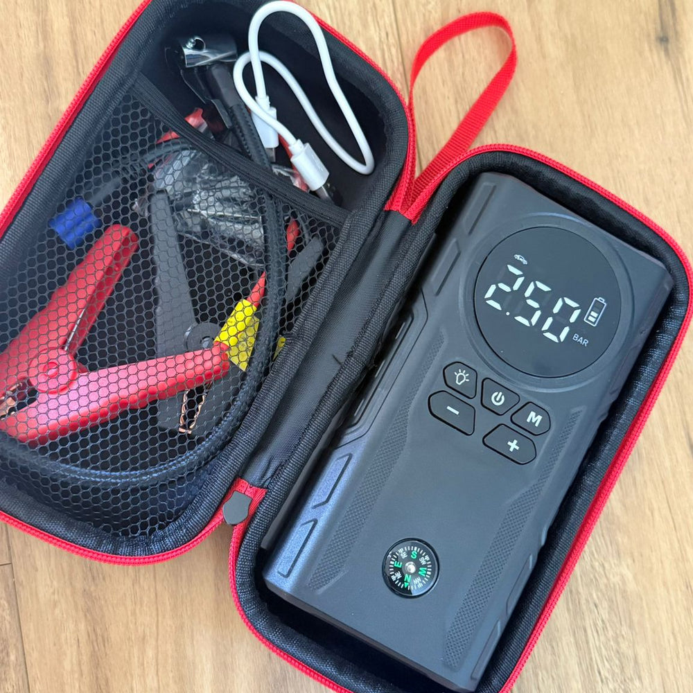 This all-in-one Jump Starter Power Pack gives you total freedom on the road — no more waiting for help or calling roadside assistance. Whether it’s a flat car battery, low tyre pressure, or a dead phone, you’re always ready to take control. Designed for reliability in any situation, it jump-starts cars, inflates tyres, and powers your devices — all from one compact, rugged unit. Perfect for daily commutes, road trips, and off-road adventures, it keeps you and your passengers safe, prepared, and confident wherever you go.