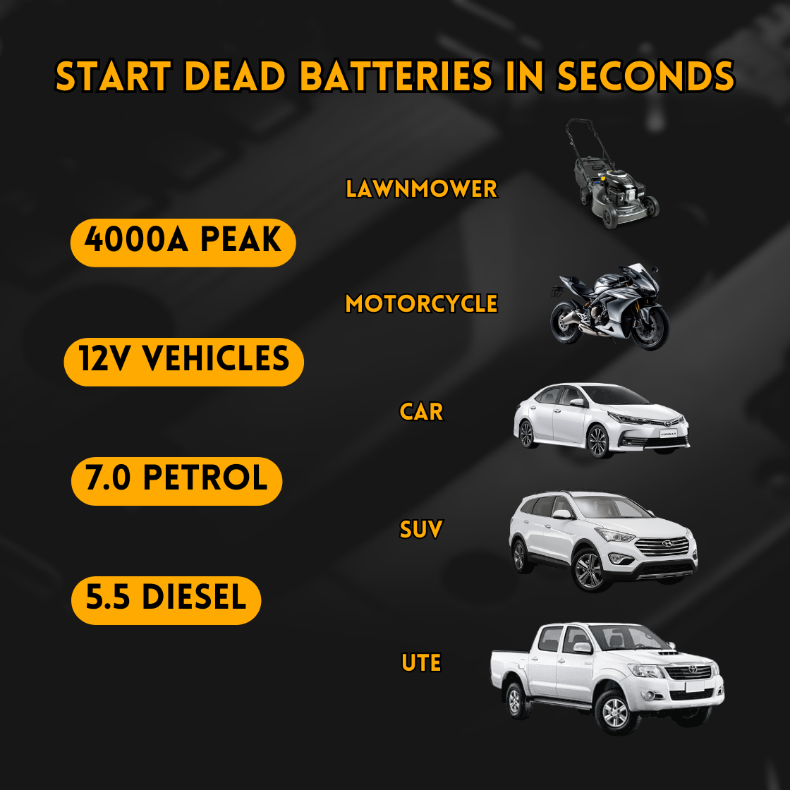 It is powerful enough to jump-start 12V vehicles with engines up to 7.0L petrol or 5.5L diesel. Perfect for cars, SUVs, utes, motorbikes, and even boats.